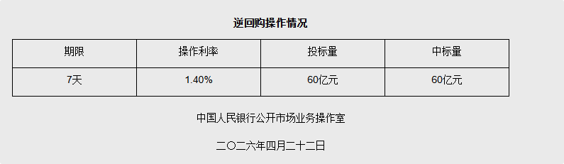 4月22日电 据央止网站新闻,2026年4月22日中原黎民银止以牢固利率、数目投标体例启铺了60亿元7天期顺归买操纵,齐额知足了1级业务商需要。详细环境以下:图片根源:央止网站截图